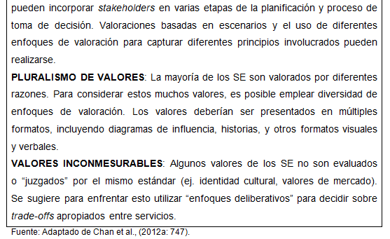 Cabe mencionar aquí que la caracterización apropiada de un servicio o valor (incluyendo valoración) es dependiente del o los métodos utilizados, y ningún método es universalmente aplicable. En este contexto, es muy poco probable que los investigadores sean capaces de identificar adecuadamente un set de SE de relevancia, valores y métodos de evaluación, sin primero involucrar a los stakeholders en la identificación de esos servicios y de sus valores de importancia crucial. Esta identificación de SE y valores relevantes puede involucrar diferentes metodologías, y permite desarrollar un proceso de caracterización que puede apoyar notablemente a los tomadores de decisión (Chan et al., 2012a; Iceland et al., 2008).