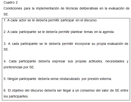 Al implementar este tipo de técnicas participativas, se asume que pequeños grupos de ciudadanos pueden plantear juicios informados sobre los bienes públicos, no solo en términos de la utilidad que generan en forma individual sino también en lo colectivo. Esto implica que el pequeño grupo se considera como el tomador de decisión (Wilson y Howarth, 2002). El rol por lo tanto de procesos que utilizan estas técnicas es contribuir a esta unidad social a articular preferencias por SE. La idea no es que el grupo llegue a negociar posturas, sino más bien que se comprometa con lograr un consenso deliberativo. De esta forma, como Jacobs, (1997) plantea: Al aceptar el modelo deliberativo para la formación de valor, significa que los valores de los SE no deberían obtenerse a través de procesos privados en los cuales los participantes son consultados por su elección en términos aislados e individuales. El valor de SE debería ser articulado públicamente, en un carácter deliberativo.