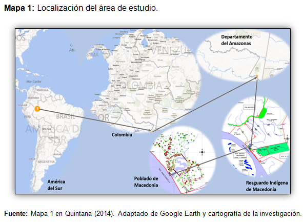El presente trabajo tuvo un enfoque de estudio de caso con una sola unidad de observación (comunidad indígena de Macedonia ubicada en el trapecio amazónico colombiano), el tipo de investigación fue etnográfica con base en la investigación-acción-participación (IAP), y tuvo cinco momentos que son: 1) gestión con los actores sociales; 2) caracterización etnográfica; 3) caracterización de la organización del territorio; 4) la visión occidental e indígena del territorio; 5) Interpretación territorial.