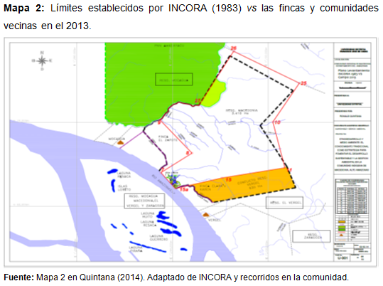 Como se puede apreciar en el mapa 2, actualmente existe un conflicto entre la linderación planteada por INCODER y las fincas Clara´s Karen y El zapote. De acuerdo con lo visibilizado en campo, el primer actor ha generado un conflicto, ya que la finca tiene como referente en el margen del río Amazonas un árbol que se desbarrancó hacia la comunidad y el nuevo cercado omite varios metros pertenecientes al resguardo indígena. Esto se traduce en una pérdida del territorio que influye en el posicionamiento del nuevo mapa.