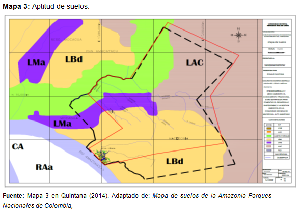 Por otro lado, se encuentra un suelo LAC que tiene una vocación de uso forestal protector-productor, al cual se le asocia la amenaza de agricultura itinerante, lo cual pudo ser verdad para la época cuando se encontraban las FARC en la comunidad, pero que actualmente no se está usando, debido a la distancia que tiene de la parte urbana de la comunidad. Dado que es un bosque con vocación de uso forestal protector-productor, se hace necesario identificar la zona para delimitar la franja de producción y de protección, lo que permitiría establecer en esta zona una explotación maderera.