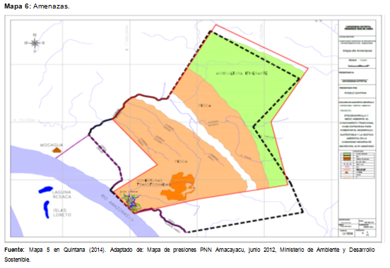 Se ha establecido que las principales amenazas para la comunidad son la pesca (zonas de quebradas), las coberturas trasformadas (zona de chagras) y la agricultura itinerante (zona de conflicto armado). Lo anterior implica, socialmente, que en épocas de verano se dificulte la pesca, la caza y el transporte a través de las quebradas (Arenal, Cesario, Primeraquebrada, Segunda quebrada, Tercera quebrada y Cuyate), haciendo más difícil la obtención de este recurso. Con respecto a la agricultura surgen propuestas como el uso de las micorrizas como solución a la problemática del sobrecultivo. Es de resaltar que esta situación no se ve en comunidades indígenas cuya tecnificación y explotación del suelo no han llevado a un empobrecimiento de sus nutrientes.