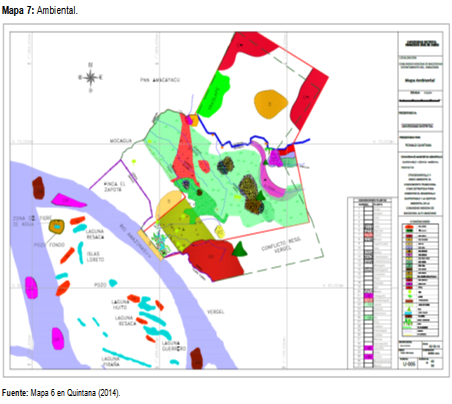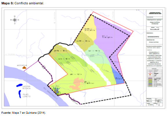 El mapa de conflicto ambiental surge de la traspolación de los mapas de suelo y el de amenazas. De esta manera se establece que las amenazas encontradas (deforestación, agricultura itinerante y pesca), junto a la identificación de los tipos de suelo, genera a aproximación más cercana hacia lo que se encuentra y se puede hacer en la comunidad, teniendo como referentes el uso del suelo y su oferta ambiental (vocación).