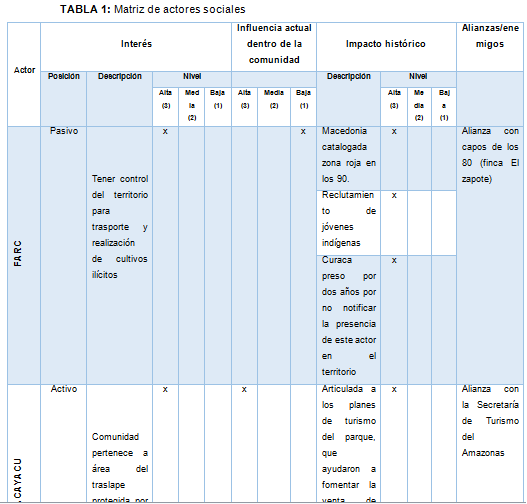El trabajo y linderación realizado en la comunidad llevó a la identificación de los actores sociales de mayor influencia dentro de la comunidad. Aquí sobresalen las zonas donde se desarrollan o desarrollaron actores que han incidido dentro de la historia geopolítica de la comunidad. El análisis de los actores sociales en el manejo del territorio llevó a la generación de la tabla 1, que evidencia el actor, la posición, interés, influencia, impacto, alianzas y enemigos, que en su totalidad llevan a un contexto local de lo mencionado anteriormente (Tabla 1).
