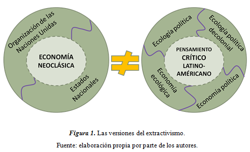 En la definición de la categoría ‘extractivismo’ se pueden identificar dos versiones desde las cuales se despliegan a la vez distintos enfoques de abordaje y maneras de entender el modelo extractivo. Una versión se profesa desde los Estados Nacionales y la Organización de las Naciones Unidas (ONU) sostenida en el enfoque de la economía neoclásica, mientras que la otra se posiciona desde el pensamiento crítico latinoamericano a través de los enfoques de la ecología política, la ecología política decolonial, la economía ecológica y la economía política.