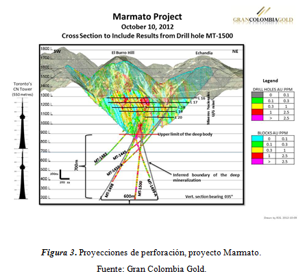 En 2005 la Compañía Minera de Caldas S.A., subsidiaria de la compañía canadiense Colombia Goldfields, compra 100 minas en la parte alta del cerro; zona que había sido establecida para explotación de pequeños mineros. Con la presencia de esta compañía se desata un conflicto de intereses entre la comunidad y el macroproyecto minero a cielo abierto promovido por la compañía extranjera. Luego, en 2009, la compañía Medoro Resources compró la empresa Colombia Goldfields y de este modo adquirió los títulos de las minas de la parte alta del cerro; adquiriendo, además, acciones de Mineros Nacionales S.A. la cual venía desde 1989 explotando la zona baja de este. A partir de 2009, Medoro Resources contrata a la empresa consultora The Social Capital Group para realizar el reasentamiento de la población en el corregimiento El Llano; sin embargo este proyecto es rechazado por la población trasladándose solo la infraestructura administrativa, educativa y de salud, así como los funcionarios públicos, por lo que el resto de la población permanece habitando el cerro. Dos años después, en 2011, Medoro Resources se fusiona con la multinacional canadiense Gran Colombia Gold Corporation. Finalmente, quien obtiene el control de la totalidad del cerro es la empresa Gran Colombia Gold Corporation. No obstante, el título de explotación minera aparece a nombre de Mineros Nacionales S.A. empresa perteneciente a la compañía extranjera. Los contratos de concesión se establecieron inicialmente con la Gobernación de Caldas hasta el año 2013 y luego de esta fecha pasaron a ser competencia de la Agencia Nacional Minera (ANM). Con esta concesión la multinacional pretende explotar 14 millones de onzas de oro y cerca de 90 millones de plata, bajo la figura de minería a cielo abierto durante 30 años; minerales que se encuentran en su mayoría al interior de la montaña y en el subsuelo de la misma (tal como se puede apreciar en la figura 3).