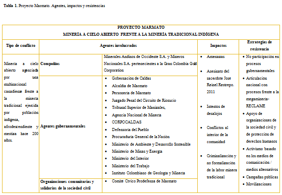 La empresa ha desalojado a los pequeños mineros comprándoles sus minas, cerrándolas y/o dejándoles sin forma de obtener empleo dado a que en Marmato el sustento primordial de la población es la minería (CRIDEC, 2011). De igual manera se han presentado hechos como el asesinato del sacerdote José Reinel Restrepo, en 2011, siendo un líder comunitario que velaba por los derechos de la comunidad y se oponía a la presencia de la multinacional; además, de las amenazas hacia la gobernadora del cabildo indígena de la parcialidad en 2016 (tabla 1).