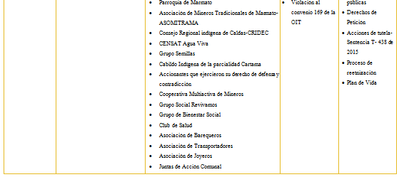 Una de las estrategias más recientes que emprendió la parcialidad indígena de Cartama frente al macroproyecto fue la interposición de un amparo de tutela, solicitando “el derecho a la Consulta Previa y los derechos al debido proceso, al trabajo, a la libertad para ejercer profesión u oficio y al mínimo vital” (Corte Constitucional, sentencia T-438 de 2015. Magistrado Ponente: Jorge Ignacio Pretelt). En primera instancia, el Juzgado Penal del Circuito de Riosucio (Caldas) declaró improcedente el amparo solicitado. Una vez proferida esta decisión, la comunidad la impugnó pasando a segunda instancia. En la Sala de Decisión Penal del Tribunal Superior de Manizales (Caldas) se confirmó el fallo impugnado. En sede de revisión, la Corte Constitucional concedió, mediante la sentencia T-438 de 2015, el derecho fundamental a la consulta previa de los miembros de la parcialidad indígena de Cartama y de la comunidad afrodescendiente asociada en ASOJOMAR; ya que estas comunidades se han dedicado a la minería artesanal e informal en la mina Villonza, localizada en la parte alta del cerro El Burro.