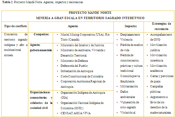 En el caso Mandé Norte operó un modelo depredador expresado en formas de acumulación por desposesión agenciadas tanto por la empresa multinacional como por algunas instancias estatales, las cuales generaron la violación de derechos a los pueblos indígenas y afrodescendientes y daños ecológicos en territorio sagrado. El agente estatal brindó las garantías necesarias para que ingresara la empresa extractiva estableciendo un contrato de concesión sin realizar la consulta previa con las comunidades; luego presentó una consulta manipulada y fraudulenta; además, delegó al ejército como agente de seguridad al servicio de la citada empresa.