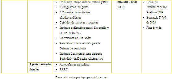 El modelo depredador se caracteriza por la violación a los derechos de los pueblos indígenas bajo la responsabilidad del Estado y la multinacional. El Estado por intermedio de la Dirección de Asuntos Indígenas, ROM y minorías del Ministerio del Interior negó en el año 2015 la existencia de población indígena en la zona, aun sabiendo que esta misma entidad certificó la existencia de la parcialidad indígena de Cartama mediante la Resolución 0046 de 03 de mayo de 2012 (figura 4). Siendo la Defensoría del Pueblo, la que verificó la existencia de la comunidad indígena. Las entidades gubernamentales como el Ministerio de Ambiente y Desarrollo Sostenible, Ministerio de Minas y Energía, Ministerio de Trabajo, Procuraduría General de la Nación, ANM, CORPOCALDAS, Policía Nacional, Alcaldía de Marmato y los operadores de justicia fungieron y fungen en alianza para proteger los intereses de la empresa extranjera; mientras la Defensoría del Pueblo es la única entidad que vela, en este momento, por los derechos de la comunidad.