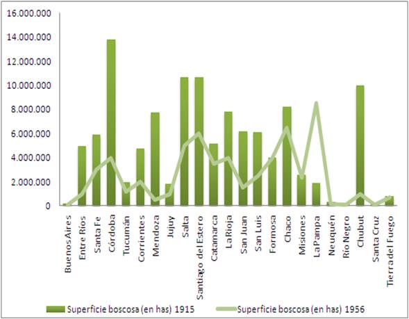 Como fuera anticipado al inicio, si bien la ley prohibió la devastación de bosques y tierras forestales y la utilización irracional de productos forestales -diversas provincias realizaron avances en cuanto a la creación de organismos específicos, legislación protectora y planes de manejo- no se logró frenar de modo definitivo la deforestación y degradación que para esos años ya avanzaba en amplias regiones del país (y de modo particular en la región chaqueña). A modo de ejemplo, el gráfico 1 ofrece estimaciones de pérdida de superficie boscosa por provincia para el período 1915-1956.