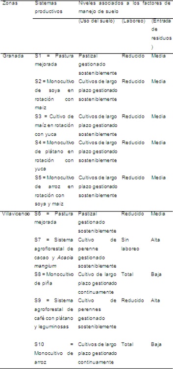 Así mismo, se realizó una caracterización de los sistemas productivos de acuerdo a algunos factores de manejo de los suelos como fueron uso del suelo, tipo de labranza y entrada de residuos (Tabla 1); seleccionando 20 fincas que incluyeran uno o más de los sistemas escogidos.
