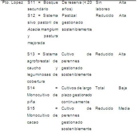 Granada: S2= Monocultivo de soya en rotación con maíz; S3= Cultivo de maíz en rotación con yuca; S4= Monocultivo de plátano en rotación con yuca; S5= Monocultivo de arroz en rotación con maíz y soya; Villavicencio: S7= Sistema agroforestal de cacao y Acacia mangium; S9= Sistema agroforestal de café con plátano y árboles de leguminosas; S10= Monocultivo de arroz; Puerto López: S11= Bosque secundario; S12= Sistema silvopastoril de Acacia mangium y pastura mejorada; S13= Sistema agroforestal de caucho y leguminosas de cobertura; S14= Monocultivo de piña; S15= Monocultivo de cacao.