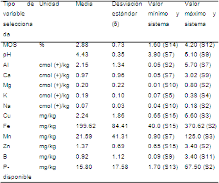 La tabla 3 presenta una descripción estadística de las variables químicas seleccionadas en el análisis multivariado relacionadas con los sistemas productivos de la Altillanura y Piedemonte.