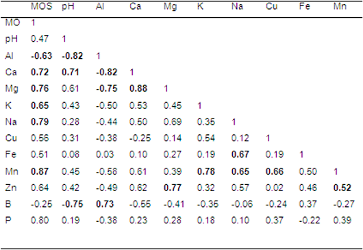 Los resultados obtenidos confirman que la materia orgánica del suelo (MOS), correlacionó con todas las características químicas del suelo, menos con B (Tabla 4), como reportado por West et al (2010). El P estuvo altamente correlacionado con la MOS (Tabla 4).