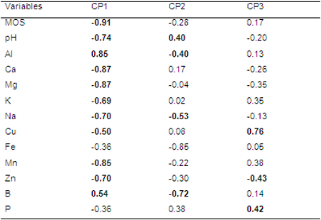 El CP2 explicó el 17.25% de la variabilidad total y se relacionó principalmente con la acidez del suelo, pH, Al, Na, Fe y B en los suelos (Tabla 5). Las variables de mayor peso en la conformación del CP3 fueron Cu, Zn y P en los sistemas evaluados, explicando el 11.84% de la variabilidad total de las propiedades químicas (Tabla 5).