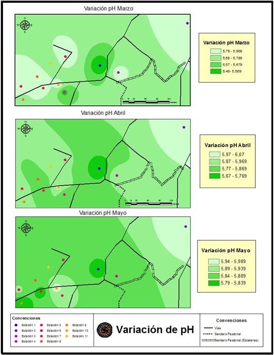 De la información anterior, se realizaron mapas de variación de pH durante el muestro (Anexo 1) y la distribución de pH en la zona de estudio (Anexo 5) a través del software arcGIS y el método de interpolación IDW (Inverse Distance Weight). En dichos mapas se evidencia como durante todo el muestreo la estación 1 es la que presenta los menores valores de pH en cada mes y en el valor promedio de pH con respecto a las demás estaciones, en cambio la estación 2 fue la que presento los valores más altos de pH en todos los meses y por ende en el valor promedio de pH.