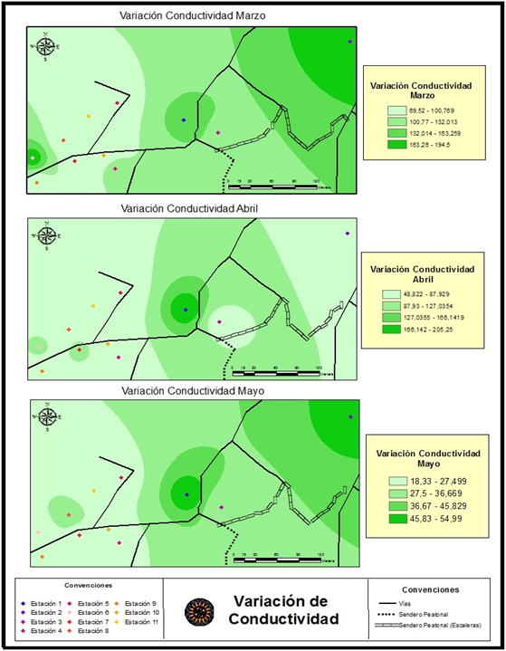 De la información anterior, se realizaron mapas de variación de conductividad durante el muestro (Anexo 2) y la distribución de conductividad en la zona de estudio (Anexo 6) a través del software arcGIS y el método de interpolación IDW (Inverse Distance Weight). En dichos mapas se evidencia como los valores de conductividad fueron descendiendo de manera sostenida durante los meses de muestreo en todas las estaciones exceptuando las estaciones 1 y 7, en las cuales se presentó un aumento de la conductividad del mes 1 al mes 2 pero luego descendieron en el mes 3. También se observa que la estación 1 es la que presenta los mayores valores de conductividad mientras que la estación 11 tiene los menores valores.