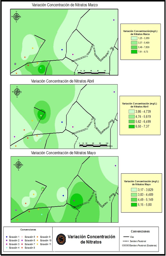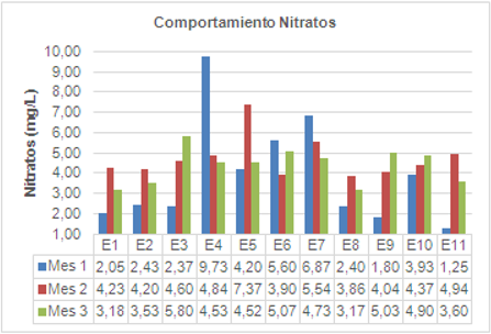Los mayores valores de la concentración de nitratos se presentaron en los meses 2 y 3 coincidiendo con la época más húmeda del muestreo. En cambio, los menores valores de la concentración de nitratos se presentaron durante el mes 1.
