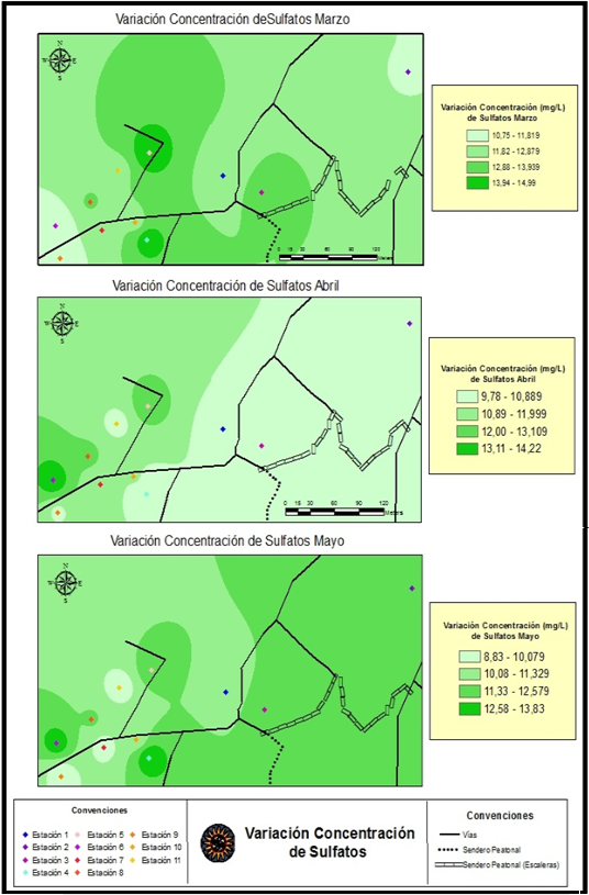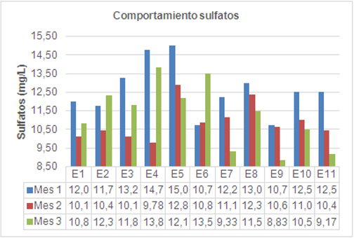 Los mayores valores de la concentración de sulfatos se presentaron en los meses 1 y 3 coincidiendo con la época más seca del muestreo. En cambio, los menores valores de la concentración de sulfatos se presentaron durante el mes 2.