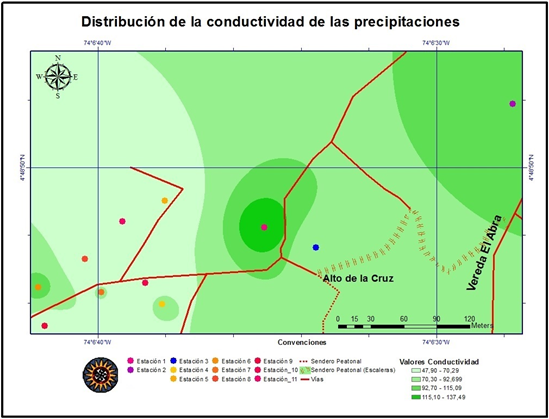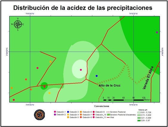 En el sector de la vereda El Abra en Cota, Cundinamarca, no es ácida debido a que su pH oscila entre 5,46 y 6,07; al compararlo con el estudio “Determinación del comportamiento ácido de las precipitaciones en La Hacienda Santa Helena, inmediaciones del cerro del Majuy en Cota, Cundinamarca y su efecto en especies liquénicas” (Acosta y Huertas, 2015) en la vereda El Abra las precipitaciones presentan un comportamiento más ácido que en la Hacienda Santa Helena ya que en esta última los valores de pH oscilaron entre 5,98 y 7,01. Además de que el área de influencia del presente estudio se encontró dentro del reguardo indígena de Cota, y las estaciones se instalaron a mayores altitudes que en la Hacienda Santa Helena.
