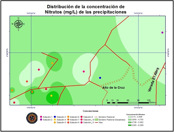 Se puede concluir que en ninguna de las estaciones se presentó lluvia ácida, aunque cabe aclarar que los valores presentados de conductividad, nitratos y sulfatos harían que la lluvia fuera ligeramente ácida. Además los valores de concentración de nitratos y sulfatos en el agua lluvia de la zona permitirían clasificarla como zona de alta contaminación, lo cual sería consistente con lo evidenciado en el mapa de dispersión realizado (Figura 5), pero inconsistente con la presencia de algunos de los líquenes identificados en la zona ya que éstos son sensibles a altos valores de contaminación, por lo que se requiere de continuar con el muestreo para contar con una serie de datos más amplia y poder llegar a conclusiones precisas sobre la contaminación en el área de estudio.