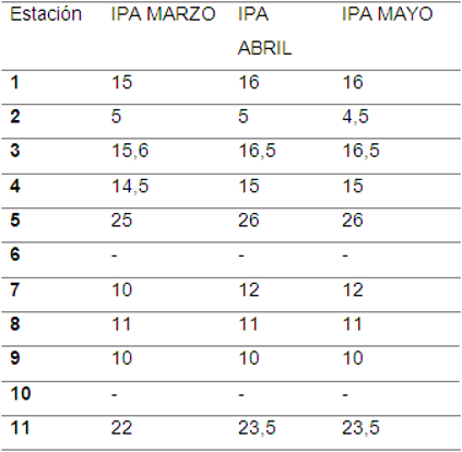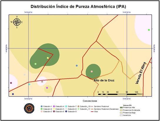 A partir de la información anterior se realizó un mapa de distribución del IPA (Anexo 9) a través del software arcGIS y el método de interpolación IDW (Inverse Distance Weight), con el cual se pudo establecer que las estaciones 5 y 11 son las que poseen los valores más altos del IPA, son las estaciones con la menor afectación y mayor cobertura y frecuencia de líquenes al igual que una buena calidad atmosférica y ambiental. Las estaciones 1, 3 y 4 presentan una cantidad liquénica moderada y, las estaciones 2, 7, 8 y 9 cuentan con una baja presencia de líquenes, indicando una baja calidad atmosférica y ambiental en dichas estaciones además hay que tener en cuenta que el área de estudio es una zona altamente intervenida por el hombre y en la que se observa una sucesión ecológica. Las estaciones 6 y 10 no presentan resultados debido a que no se encontraron forófitos que cumplieran con los requisitos establecidos para calcular el IPA.