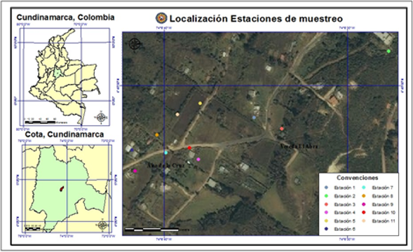 El muestro se realizó en el sector del Alto de la Cruz, Vereda El Abra, mediante la instalación de 11 estaciones como se muestra en la figura 1. La zona de estudio se encuentra dentro de la Serranía El Majuy y colinda con el resguardo indígena ubicado en la misma. Los criterios de selección que se aplicaron para definir los puntos de muestreo fueron: