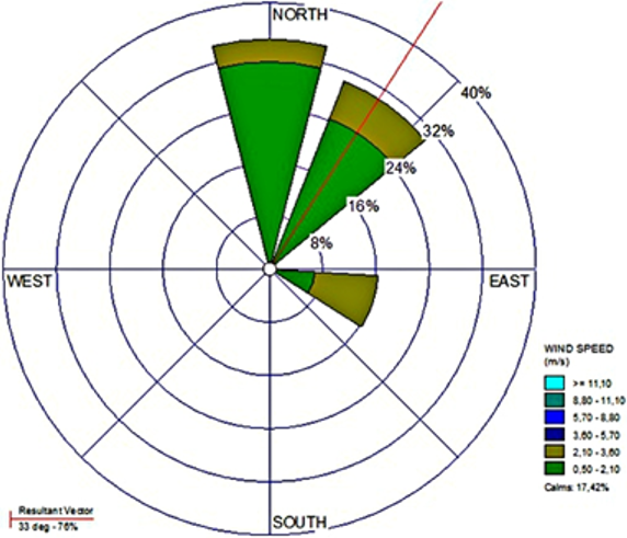 A partir de los datos obtenidos de velocidad y dirección del viento de la estación meteorológica ubicada en la zona de estudio y los datos de las estaciones de la CAR ubicadas en Tabio y el aeropuerto de Guaymaral se realizó la rosa de los vientos correspondiente (Figura 4).