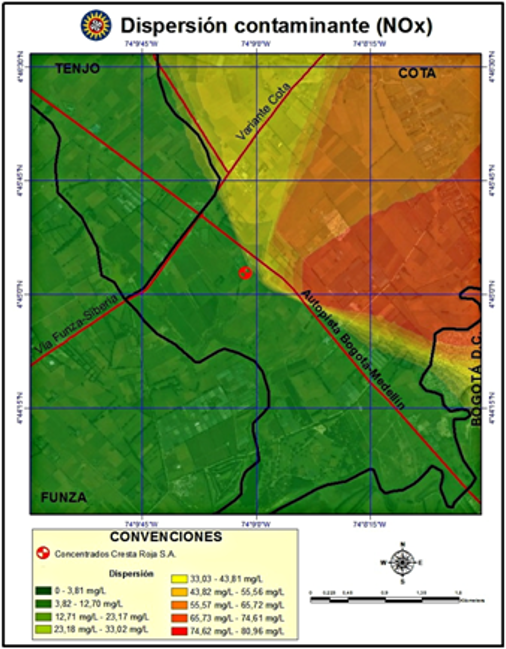 Con la anterior rosa de vientos y los datos de emisión de la empresa Concentrados Cresta roja S.A.1 proporcionados por la CAR, se realizó la modelación de dispersión de contaminante (NOx) desarrollándose el mapa de dispersión (Figura 5) a través del software arcGIS y el método de interpolación IDW (Inverse Distance Weight).