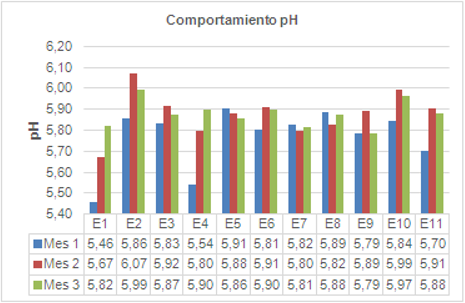 Los datos obtenidos de pH durante el muestreo muestran que los datos no se encuentran demasiado dispersos entre sí (Figura 6). Los menores valores de pH se presentan en las estaciones 1 y 4 durante el mes 1 mientras que los más altos se presentaron en el mes 2 en las estaciones 2 y 10.