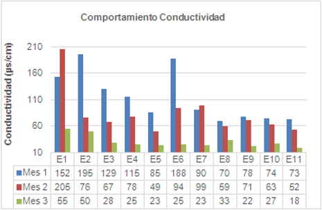 Los mayores valores de conductividad se presentaron en el mes 1 coincidiendo con la época más seca del muestreo. En cambio, los menores valores de conductividad se presentaron durante el mes 3. Durante el tiempo de muestreo los valores de conductividad fueron altos debido posiblemente a la cercanía de las estaciones a vías sin pavimento y a la dispersión de plaguicidas y fertilizantes en los cultivos y pastos cercanos a las estaciones.