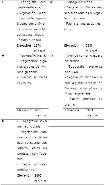 En cuanto a los bioindicadores en el presente estudio se encontraron 4 especies Cortícolas (Cetrelia sp., Flavopunctelia sp., Usna sp1., candelariela xanthostigma sp.) frente a las 4 especies en el estudio mencionado, pero a diferencia del estudio anterior el presente estudio tuvo en cuenta otro sustrato (roca), en el cual se presentó un número de 6 especies (Hypotrachyna sp., Xanthoparmelia lecanorales sp., Usnea sp2., Acarospora socialis sp., Caloplaca xantholyta sp., Caloplaca aurantia sp.); por lo que se concluye que existe una mayor cantidad (diversidad) especies en el sustrato roca que en el sustrato corteza.