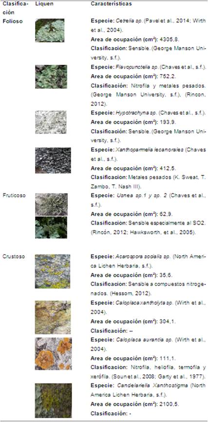 Dentro de esa determinación del posible comportamiento ácido de las precipitaciones se seleccionaron algunas especies de líquenes como bioindicadores ya que estos son organismos o comunidades que presentan cambios en su morfología cuando son expuestos a la contaminación ambiental, dichos comportamientos pueden ser identificados frente a varios grados de alteración (Lijteroff et al., 2009). Cada agente contaminante incide de manera diferente en los seres vivos y ecosistemas, produciendo una respuesta particular conforme a la combinación, concentración y permanencia en el ambiente, por lo que el comportamiento de los bioindicadores frente a estas condiciones es indicio de cambios en la calidad ambiental (Rubiano y Chaparro, 2006).
