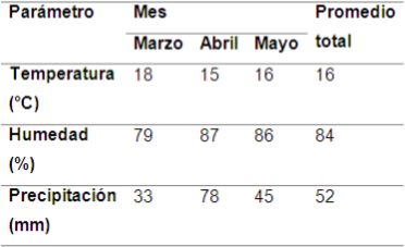 Se presentó una temperatura media de 16°C, una temperatura máxima de 22°C y una mínima de 10°C. La temperatura de la zona de estudio también se vio afectada por el Fenómeno del Niño del año 2016.