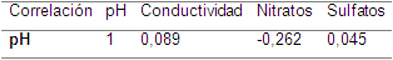 Como se observa en la tabla anterior, la variable que presenta una mayor relación con el comportamiento ácido de la lluvia sería la concentración de nitratos, aunque dicha relación es débil y negativa (inversamente proporcional a los valores de pH).