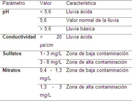 Para determinar el comportamiento ácido de las precipitaciones del área de estudio se empleó la información de la siguiente tabla: