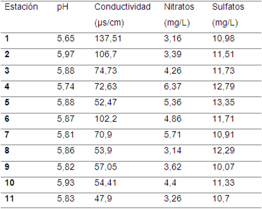 Los datos mensuales de pH, conductividad, concentración de nitratos y concentración de sulfatos se promediaron por estación, como se muestra a continuación: