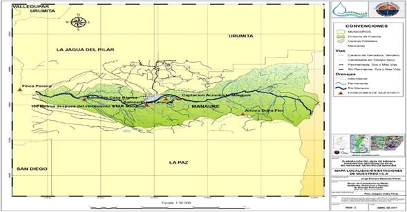 Se ubicaron seis estaciones en cada uno de los ríos y se tuvieron en cuenta las recomendaciones de la Guía Metodológica de la Política Nacional del Recurso Hídrico y la Metodología General para la presentación de estudios ambientales del Ministerio de Ambiente, Vivienda y Desarrollo Territorial (MAVDT) (MAVDT, 2010). Las estaciones establecidas en el río Manaure en orden ascendente fueron el Arroyo Doña Flor (E1), Captación Acueducto Manaure (E2), Balneario Caracolí (E3), Sistema de tratamiento de aguas residuales STAR Manaure (E4), Balneario Casa Blanca (E5) y Finca Pereira (E6) (Figura 1). En ese mismo orden para el río Casacará las estaciones correspondieron al Arroyo Trementina (E1), Vereda Carrizal (E2), Acueducto Casacará (E3), Finca María Josefa (E4), Puente Amarillo (E5) y la Intercesión río Sicararé - río Casacará (E6) (Figura 2).