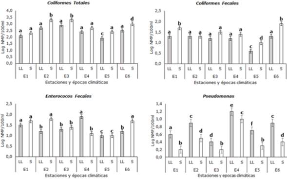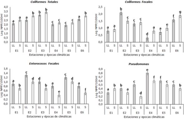 En ese mismo orden, el río Casacará presentó la mayor concentración de coliformes totales (2419,2 NMP/100mL) en la estación E3 para el tiempo de sequía, mientras que en el periodo de lluvias fueron superiores las cuantificaciones de coliformes fecales (118,6 NMP/100mL), enterococos fecales (20,6 NMP/100mL) y P. aeruginosa (6,4 NMP/100mL) registradas en la estaciones E2 y E4 respectivamente. Por lo contrario, las estimaciones más bajas de coliformes totales (75,8 NMP/100mL) y coliformes fecales (2,2 NMP/100mL) se obtuvieron en la época de lluvias y las de enterococos fecales (2,6 NMP/100mL) y P. aeruginosa (1,5 NMP/100mL) en la temporada seca (Figura 4). Se establecieron diferencias significativas entre los parámetros microbiológicos analizados para las dos temporadas climáticas monitoreadas (P ≤ 0,05).