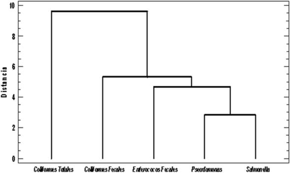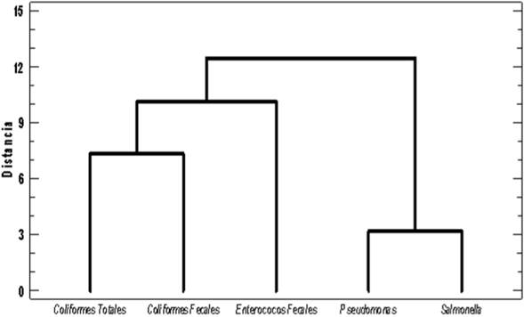El dendrograma diseñado para el río Manaure (Figura 5) muestra la conformación de tres grupos: 1) Enterococos fecales, Salmonella y P. aeruginosa, comportamiento altamente homogéneo, 2) Coliformes fecales moderadamente homogéneas y 3) Coliformes totales, correspondiendo al grupo menos homogéneo. Con respecto al río Casacará (Figura 6), se presentó una situación similar, formándose tres grupos: 1) Salmonella y P. aeruginosa, correspondieron a los parámetros con el comportamiento más homogéneo, 2) Enterococos fecales, moderadamente homogéneo y 3) Coliformes totales y Coliformes fecales, con el comportamiento menos homogéneo. Sin embargo, a diferencia del Río Manaure, aquí se observa la conformación de dos conglomerados que resaltan la diferencia que hay en el comportamiento de los grupos de microorganismos.