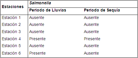 Los análisis de aislamiento e identificación del género Salmonella a partir de las muestras de agua de los ríos Manaure y Casacará, solo fueron detectados en las estaciones E4 y E6 tanto en la temporada de lluvias como en la de sequía (Tabla 1).