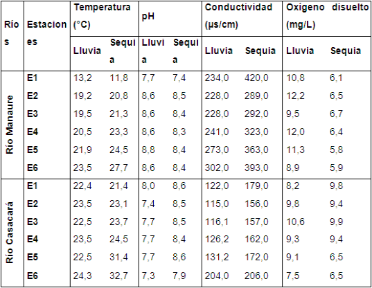 La Tabla 2 muestra los valores de los parámetros fisicoquímicos evaluados in situ. La temperatura del agua registrada en las dos temporadas climáticas mostró variaciones entre las estaciones, manteniéndose aproximadamente entre los 13,2°C - 27,7°C (Río Manaure) y 22°C - 32°C (Río Casacará). Los valores de pH de los sistemas hídricos tanto en la temporada de lluvias como de sequía mantuvieron una tendencia hacia la alcalinidad, comprendiendo valores desde 7,3 - 8,6 (sequía) hasta 7,3 - 8,8 (lluvias). Mientras, que los valores correspondientes a la conductividad eléctrica fueron mayores en la época seca (156 - 400 µS/cm). Así mismo, los niveles de oxígeno disuelto registraron concentraciones con rangos desde 5,8 - 9,8 mg/L (temporada de sequía) y de 8,2 - 12,2 mg/L (temporada de lluvias).