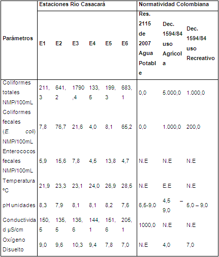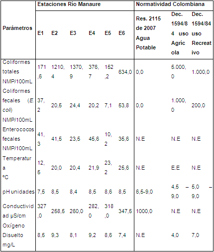 Los resultados de los análisis microbiológicos obtenidos en las muestras de agua de los ríos Manaure y Casacará se compararon con la normatividad colombiana vigente para la calidad del agua.