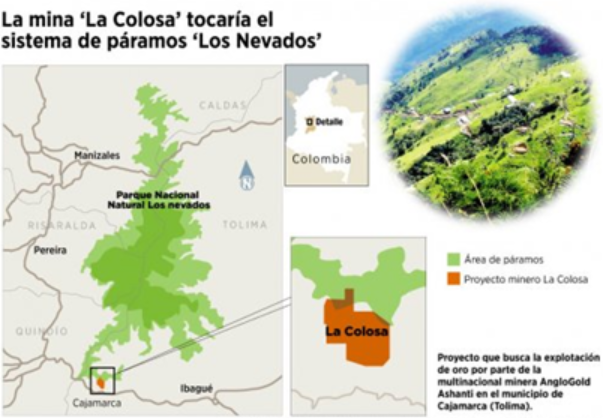 En el caso de La Colosa, en el Tolima, existe un título minero a favor de la trasnacional surafricana AngloGold Ashanti, que le permitiría a esta realizar explotación del oro a cielo abierto, sin tener en cuenta las consecuencias nefastas el agua y el suelo del territorio circundante (fig. 1).