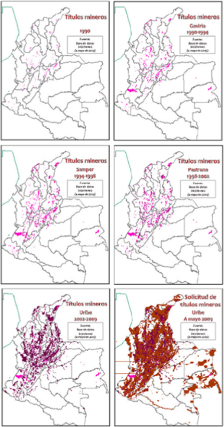 La importancia del tema ha sido tal que puede afirmarse que durante los gobiernos del expresidente Álvaro Uribe y el actual presidente, Juan Manuel Santos, la minería ha sido el caballito de batalla cuando se habla de desarrollo para el país. Infortunadamente, y no podemos olvidarlo, también ha sido de público conocimiento la corrupción en la entrega de títulos para la explotación de los bienes primarios en Colombia (ver mapa: Rudas, 2010, citado en Andrade).