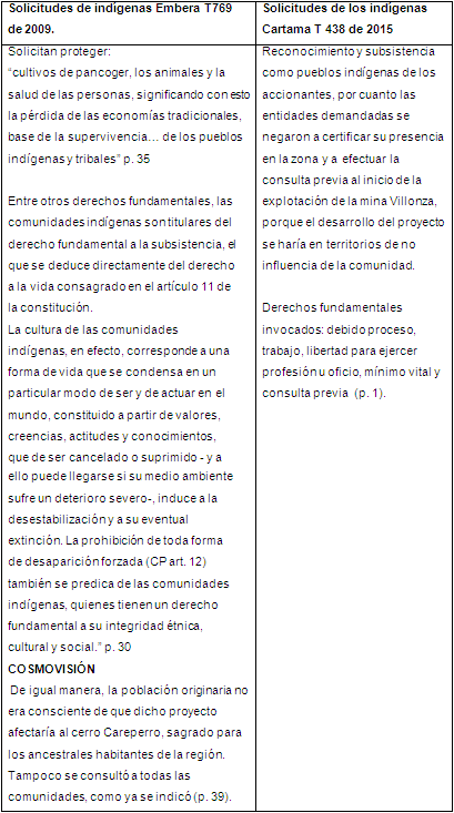 En el segundo caso, Cartamas contra Colombia Mining se verificó una alianza de estos indígenas con mestizos y comunidades negras para la explotación de la mina Villonza, que aunque el caso parecía ser apoyado por la Corte Constitucional, esta expectativa se desvaneció con la poco argumentada anulación de la sentencia T 438 de 2015.