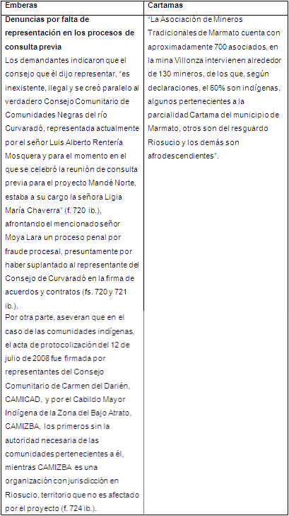 During the prior consultation process in the first case, it was verified that there were ‘pseudorepresentatives’ of the communities that were criminally sued due to the falseness in the representation. It was also verified that a pre-consultation was carried out with the Embera indigenous community from another municipality, Riosucio (Caldas), which was not part of the project in question.