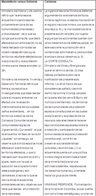 Through the analysis of two case studies -Emberas versus Muriel Mining Corporation in the sentences of the Constitutional Court, writ of amparo T 769 of 2009, and indigenous Cartama versus Gran Colombia Gold, writ of amparo T 438 of 2015- the actions of the State, the indigenous communities and the transnational companies will be analyzed through the triangulation of data and the socio-legal analysis of social participation facing mining extraction, and the actions of each of these actors regarding prior consultation in gold mining, will be questioned.