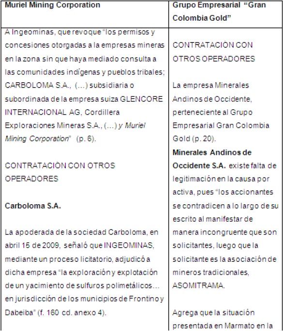 In the second case, it is evident how transnational corporations subcontract with Colombian companies forming the triple alliance State, transnational corporations and local powers, that Boaventura de Sousa analyzes, and that authors such as Amparo Rodríguez and Cesar Rodríguez point out with examples in their books on prior consultation.